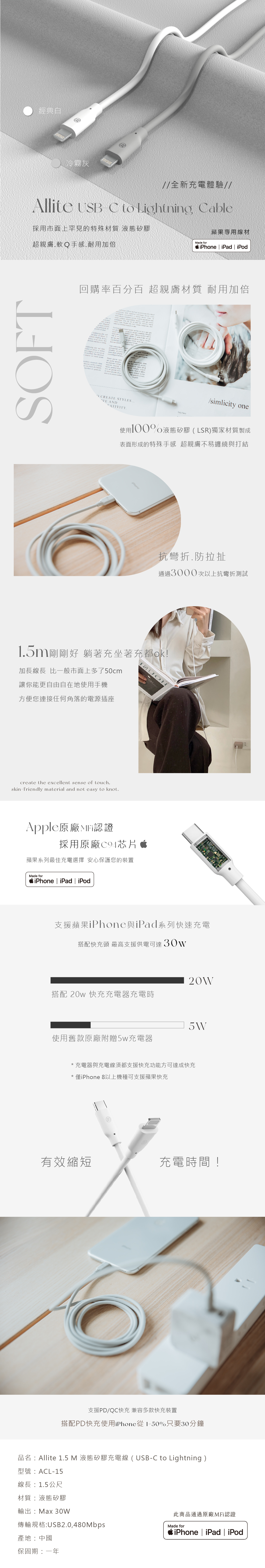 Allite 1.5M 液態矽膠充電線 USB-C to Lightning